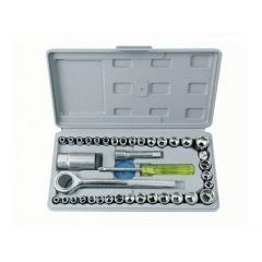 Zestaw kluczy nasadowych 40 sztuk klucze nasadoweNa zestaw składają się: 15 kluczy nasadowych od 4.5 do 16mm, 14 kluczynasadowych od 5/32 do 9/16, 3 klucze nasadowe typu gwiazdka o rozmiarze1/4, 3/8, 5/16, 1 klucz nasadowy 13/16(21mm)SP, 2 przedłużki, kluczz grzechotką oraz 2 wymienne tryby.