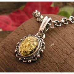 ADYGA - srebrny wisiorek z bursztynem Wytworny, srebrny oksydowany wisiorek, w którego niezwykle delikatny ażurowy wzór wkomponowano piękny bałtycki bursztyn o zielonym zabarwieniu. Biżuteria wykonana została z dbałością o każdy szczegół. Wymiar motywu zdobniczego: 10 x 12 mmDługość z zapięciem 22mmSrebro: 925W naszej ofercie znajdziesz także kolczyki, pierścień oraz bransoletkę. Kupując komplet oszczędzasz!