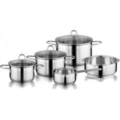 Elo Lima Sol Komplet z pokrywami szklanymiKomplet Lima Sol wykonany został ze stali nierdzewnej 18/10. Naczynia posiadają ergonomiczne dno kapslowe. W każdym naczyniu wewnątrz znajduje się skala litrażowa, ułatwiająca użytkowanie. Razem z kompletem otrzymują Państwo wkładkę do gotowania na parze. Naczynia można wstawić do piekarnika do temperatury 240 stopni C. W skład kompletu wchodzą:- garnek do gotowania z pokrywą o średnicy 16 cm i pojemności 1,8 l- garnek do gotowania z pokrywą o średnicy 20 cm i pojemności 3,4 l- garnek do gotowania z pokrywą o średnicy 24 cm i pojemności 5,6 l- wkładka do gotowania na parze o średnicy 24 cm i pojemności 2,3 l- rondelek z trzonkiem o średnicy 16 cm i pojemności 2,3 l