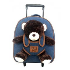 Dziecięcy plecak na kółkach z odpinaną zabawką. Został zaprojektowany i wykonany w bardzo oryginalnym stylu z wysokiej jakości materiału. Jednokomorowy z zapięciem na suwak, regulowanymi ramionami i górnym uchwytem do wygodnego przenoszenia. Posiada stelaż na kółkach z wyciąganą rączką, który niesamowicie odciąży plecy naszego maluszka oraz maskotkę w kształcie misia przyczepioną na przodzie plecaka. Zarówno przytulankę jak i stelaż bez trudu można odłączyć od plecaka.