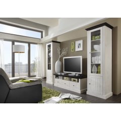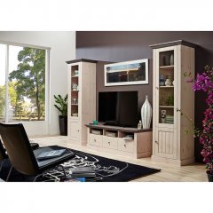 Dane szczegółowe Opis produktuKod produktu12036Materiałdrewno sosnowe bieloneKolorbiały/brązowyWymiarySzafka TVwysokość: 49 cmszerokość: 145 cmgłębokość: 56 cm2 x Witryna wysokość: 190 cmszerokość: 63 cmgłębokość: 47 cmStan produktudo samodzielnego montażuCechy charakterystyczne :elegancki designwysoka jakośćzachowanie norm ekologicznychwszystkie produkty wykonane są z drewna tj. z sosny bielonejWyposażenie :Szafka TV - 3 szuflady, 3 półki2 x Witryna - 2 drzwiowametalowe uchwyty Sposób czyszczenia :elementy z litego drewna - wilgotna szmatka nasączona czystą letnią wodąMontaż :meble dostarczamy w paczkach do samodzielnego montażuGwarancja :2 lata Salon, który zmieni całe twoje mieszkanie!MONACO  romantyczny salon sosna bielona/stone to wyjątkowy zestaw specjalnie dobranych, eleganckich mebli. Zaspokoi gust nawet najbardziej wybrednych i wymagających klientów. Utrzymany w romantycznym stylu łączy w sobie elementy klasyki i nowoczesności. Dwie przeszklone witryny oraz szafka TV wykonane są z przepięknej sosny bielonej, która wypełni blaskiem ciemne pomieszczenie. Metalowe uchwyty dodadzą twojemu wnętrzu industrialnego charakteru. Ponadto meble są niezwykle pakowne ? za zdobionymi drzwiczkami znajdują się przestronne szafki, w których pomieścisz dowolne przedmioty. Biało-czarna kolorystyka podkreśla tradycyjny charakter zestawu. Masywne elementy poszczególnych mebli sprawiają wrażenie stabilności i dostojności.