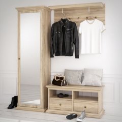 Dane szczegółowe Opis produktuKod produktu16194Materiałpłyta meblowa/płyta MDFKolordąb sonomaWymiarySzafkaszerokość: 103 cm wysokość: 51 cm głębokość: 42 cmpółka/wnękaszerokość:  45 cmwysokość:  15,3 cmgłębokość:  37,6 cmSzafa szerokość: 63 cm wysokość: 201 cm głębokość: 40 cmWieszakszerokość: 103 cm wysokość: 40 cm głębokość: 34,5 cmStan produktudo samodzielnego montażuCechy charakterystyczne :elegancki designwysoka jakośćzachowanie norm ekologicznychWyposażenie :Szafka TV/Szafka na butySzafa z lustremWieszak z półką i haczykamiSposób czyszczenia :wilgotna szmatka nasączona czystą letnią wodąMontaż :meble dostarczamy w paczkach do samodzielnego montażuGwarancja :2 lata
