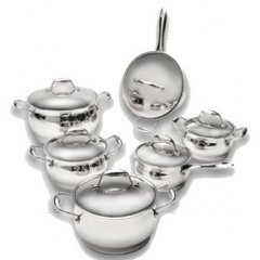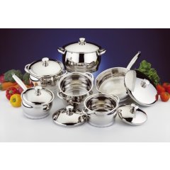 Komplet naczyń 12- elementowy CosmoNaczynia z kompletu Cosmo wykonane zostały ze stali nierdzewnej. Zaokrąglony kształt naczyń dodaje im wyjątkowego uroku. Naczynia posiadają 6-cio warstwowe dno, pozwalające na szybkie i energooszczędne gotowanie. Pokrywy naczyń wykonane zostały ze stali nierdzewnej. W skład kompletu Cosmo wchodzą:- rondel z pokrywką o średnicy 16 cm i pojemności 1.8l- garnek z pokrywką o średnicy 16 cm i pojemności 1.8l- garnek z pokrywką o średnicy 18 cm i pojemności 2.5l - garnek z pokrywką o średnicy 20 cm i pojemności 3.8l- garnek z pokrywką o średnicy 24 cm i pojemności 6.3l- głęboka patelnia z pokrywą o średnicy 24 cm i pojemności 2.5l