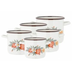 Komplet garnków emaliowanych CebulaKomplet naczyń ozdobiony został delikatnym wzorem. Proste naczynia posiadają specjalnie wywinięte brzegi, dzięki czemu w łatwy i prosty sposób wylejemy ich zawartość. Wnętrze naczyń pokryte zostało szczelną i bezpieczną powłoką emaliowaną. W skład kompletu wchodzą:- garnek o średnicy 14 cm, pojemności 1,9 l i wysokości 12,5 cm- garnek o średnicy 16 cm, pojemności 2,9 l i wysokości 14 cm- garnek o średnicy 18 cm, pojemności 3,9 l i wysokości 15,5 cm- garnek o średnicy 20 cm, pojemności 5,2 l i wysokości 15,5 cm- garnek o średnicy 22 cm, pojemności 6,6 l i wysokości 18.