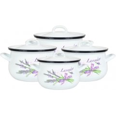 Komplet "Baryłka" 16,18,20,22 cm z pokrywami8 elementowy komplet emaliowanych garnków z serii Baryłka, to kombinacja tradycyjnej technologii produkcji z niezwykle praktycznym wypukłym kształtem oraz ciekawym wzornictwem. Garnki Baryłka są bardzo dobrą alternatywą dla droższego kompletu Pyza. W bogatej ofercie znajdą coś dla siebie zarówno osoby szukające wzorów współczesnych jak i Te stawiające na tradycję. Cechy charakterystyczne:w skład kompletu wchodzi 4 garnki + 4 metalowe pokrywy,występuje w bogatej kolorystyce i zdobnictwie (przewaga na tle konkurencji),garnki mają ręcznie malowany, wywijany brzeg, co pozwala na łatwe utrzymanie czystości,lekka pokrywa w kolorze garnka,możliwość dopasowania do kompletu czajnika emaliowanego o symbolu 585G,nadają się do mycia w zmywarkach,można je wstawiać do piekarnika wraz z pokrywą,Komplet zawiera:Garnek 16 cm (2L) + pokrywa metalowa,Garnek 18 cm (2,8L) + pokrywa metalowa,Garnek 20 cm (3,7L) + pokrywa metalowa,Garnek 22 cm (4,8L) + pokrywa metalowa.