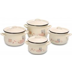 Komplet garnków emaliowanych prostych Basic CreamKomplet garnków prostych w kolorze kremowym wykonany został z wysokiej jakości stali nierdzewnej pokrytej emalią. Wewnętrzna powłoka jest bardzo szczelna i gładka dzięki czemu naczynia są bezpieczne dla zdrowia. Ze względu na wywijany ręcznie malowany, emaliowany brzeg (zamiast okuwki metalowej) naczynia mogą być stosowane przez alergików. W skład kompletu wchodzą:- garnek o średnicy 14 cm i pojemności 1,9 l- garnek o średnicy 16 cm i pojemności 2,9 l- garnek o średnicy 18 cm i pojemności 3,9 l- garnek o średnicy 20 cm i pojemności 4,8 l.