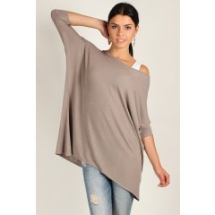 Makadamia M18 tunikaStylowa tunika damska typu nietoperz. - rękaw 3/4 - dekolt okrągły - pozwalający na noszenie z odsłoniętymi ramionami - luźny fason oversize - miękka i elastyczna dzianina w prążki - boki delikatnie wydłużone - fason świetnie prezentuje się na sylwetce, jest niezwykle komfortowy - produkt wyprodukowany w Polsce Skład: 95% wiskoza, 5% elastan. Szerokość w biuście: 2 x 70* cm (po rozciągnięciu 2x80 cm)Długość rękawa na zewnątrz: 44 * cmDługość całkowita:70* cm