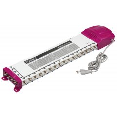 MULTISWITCH SMART LINE 5/16 CORABNajważniejsze cechyaktywne wejście DVB-Tzewnętrzny zasilaczkompaktowa obudowaWymiary: wys. 50mm, dł. 255mm. szer. 160mm.PrzeznaczenieMultiswitch przeznaczony jest do rozbudowy wewnętrznej instalacji antenowej systemu telewizji satelitarnej i naziemnej.OPISCORAB MULTISWITCH SMART LINE jest to urządzenie służące do rozdzielenia sygnału telewizyjnego, posiada 5 wejść: 4-y satelitarne i 1-dno naziemne oraz 16 wyjść satelitarno-naziemnych. Multiswitch posiada wewnętrzny zasilacz a wysokiej jakości obudowa gwarantuje wysoki poziom ekranowania. W przypadku zbyt silnego sygnału urządzenie ma możliwość obcięcia go o +/- 20bB za pomocą przełącznika "active".Przy montażu urządzenia prosimy uwzględnić istniejące warunki instalacyjne dotyczące:zasilanialokalizacji z dala od wpływu warunków atmosferycznychzabezpieczenia przed dostępem do urządzenia osób postronnychodpowiedniej wentylacjiNależy zwrócić szczególną uwagę na prawidłowe i staranne wykonanie montażu wtyków typu F na przewodach.Kable antenowe przyłączeniowe sygnał do urządzenia powinny być najwyższej jakości spełniające odpowiednie normy techniczne umożliwiające prawidłową pracę urządzenia.Urządzenie umożliwia podłączenie do 16 tunerów satelitarnych. Multiswitch automatycznie rozpoznaje rodzaj sygnału jaki będzie przekazywany do tunerów.SPECYFIKACJA TECHNICZNAAKCESORIA