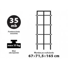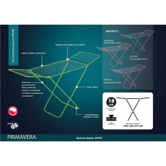 Suszarka Primavera standard zielonaSuszarka malowana farbą proszkową, odporną na działanie promieni UV i czynników zewnętrznych.Można stosować ją zarówno wewnątrz, jak i na zewnątrz. Lekka i stabilna, zajmuje mało miejsca po złożeniu.Kolorowe elementy plastikowe. Antypoślizgowe nakładki na nóżki.Posiada certyfikat TUV.
