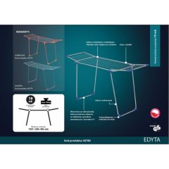 Suszarka do bielizny Edyta metalicSuszarka malowana farbą proszkową, odporną na działanie promieni UV i czynników zewnętrznych.Można stosować ją zarówno wewnątrz, jak i na zewnątrz.Kolorowe elementy plastikowe. Nogi zabezpieczone są przed samoczynnym złożeniem.Antypoślizgowe nakładki na nóżki.